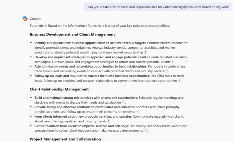 Having access to the entire Microsoft 365 environment, as well as all of the information on the Internet, provides really valuable internal and external context in one place. It has been an amazing resource to find information that addresses questions like: Who are we? Who are you? What do we do? How do we do it? And what else should be considered?